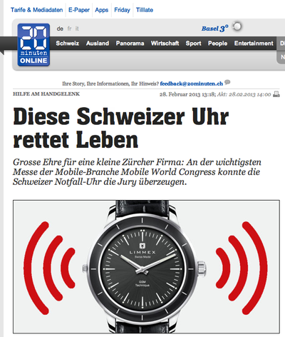 Auch 20min.ch berichtet über den Erfolg der Limmex Notfall-Uhr.